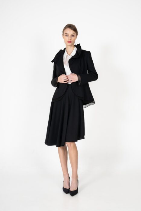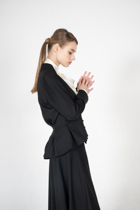 高密度トロピカルウールの素材を使用した花が咲いたようなペプラムジャケット。ウエストから開いたペプラムが特徴。端正なシルエットと美しい仕立てが特徴で、羽織るだけで全体のスタイリングに気品と存在感を与えてくれます。